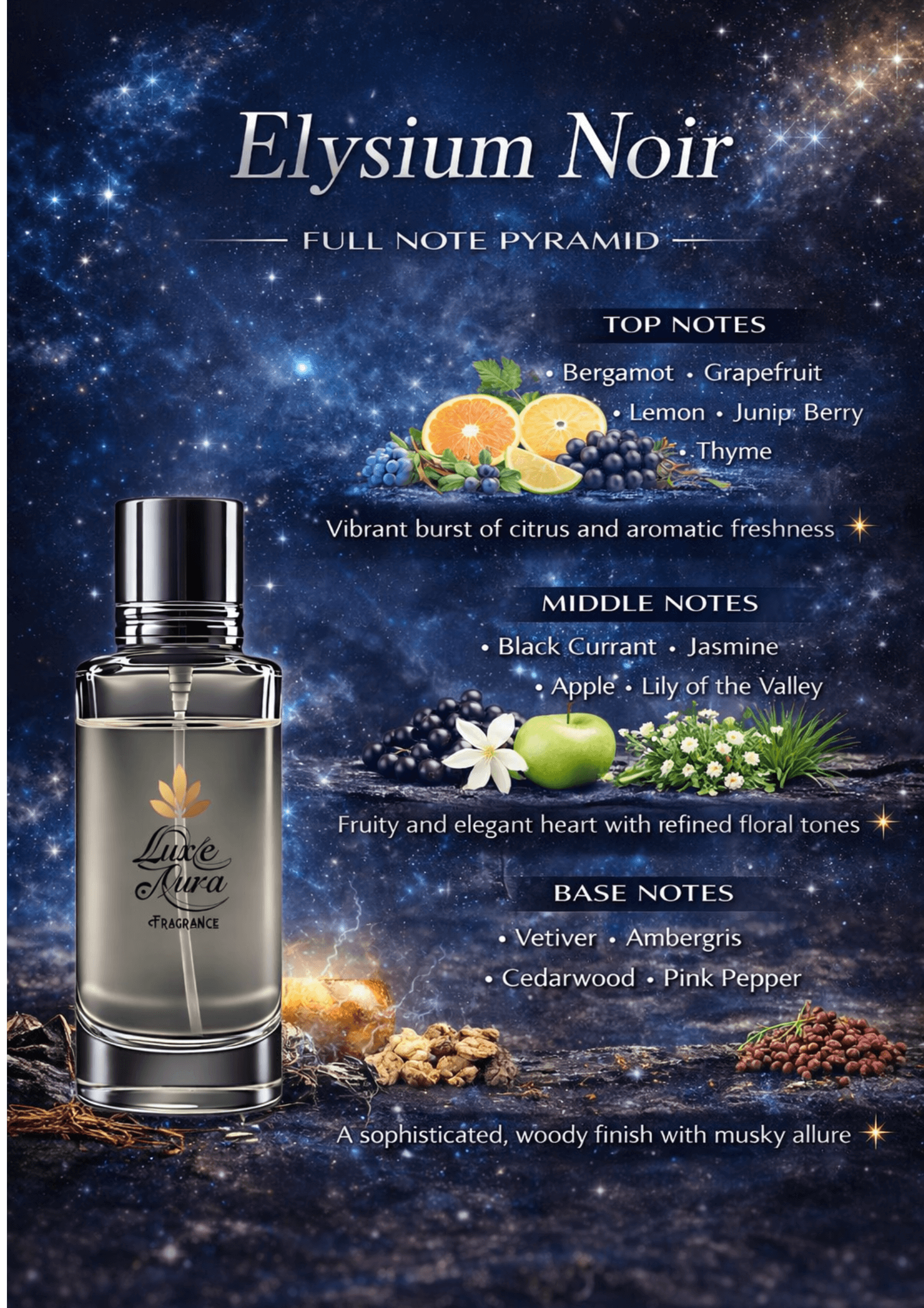 إليسيوم نوار عطر فاخر للرجال، يتميز بنفحاته العطرية الفوجيرية. تنقسم مكونات العطر إلى ثلاث طبقات: