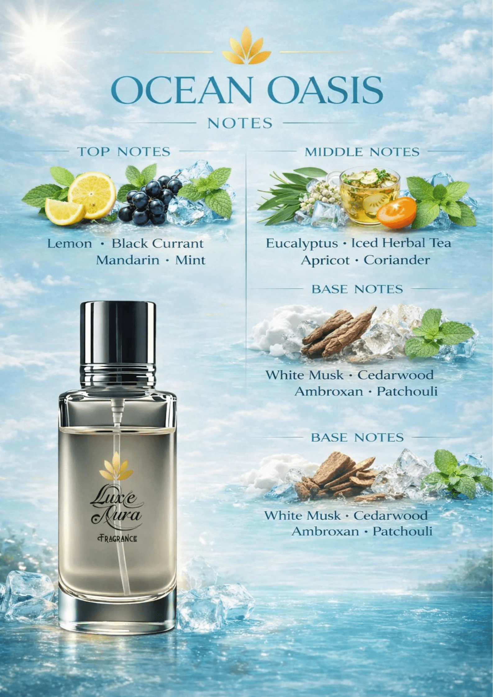 Ocean Oasis هو عطر استوائي كريمي، يمزج بين روائح الحمضيات المنعشة مع قاعدة غنية ومريحة.
